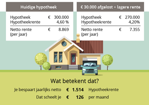 Het huis van Martijn is € 300.000 waard. Hij leent dus 100% van de waarde van zijn huis tegen bijvoorbeeld 4,6% Als hij € 30.000 aflost, leent hij nog maar 90% van de woningwaarde. Dat betekent dat Martijn in een andere risicoklasse terechtkomt. Zijn bank rekent hiervoor bijvoorbeeld een hypotheekrente van 4,2%. Martijn gaat dus 0,4% minder hypotheekrente betalen.