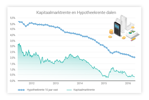 De hypotheekrente is al bijna twee jaar lang historisch laag. Dat komt door de steeds maar dalende kapitaalmarktrente. In augustus 2014 bereikte deze rente het laagste punt sinds het jaar 1540. Sinds die datum daalde de kapitaalmarktrente nog veel verder. Op dit moment bedraagt deze 0,3%. De hypotheekrente daalt met hetzelfde tempo. Gaat ook de actuele hypotheekrente richting het nulpunt?