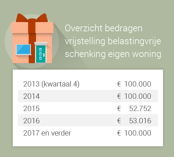 De verhoging van de belastingvrije schenking tot € 100.000 voor de eigen woning is eerder dit jaar bekend gemaakt. Dit jaar bedroeg de maximale schenking nog de helft minder, namelijk € 53.016. Bovendien mag je dit bedrag nu alleen belastingvrij aan je kinderen schenken. Ook dat verandert.