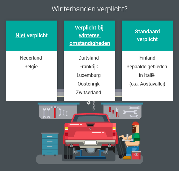 Winterbanden zijn geen verkooptruc van de garage. Ze geven meer grip op de weg bij sneeuw en ijs. De meeste landen kennen een verplichting van winterbanden bij winterse omstandigheden. Dit is bijvoorbeeld het geval in Duitsland, Frankrijk en Oostenrijk. In de Aostavallei in Italië zijn winterbanden standaard verplicht, ongeacht het weer. De exacte regels per land kun je bekijken op de website van de ANWB