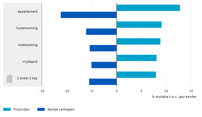 Van alle woningtypes zijn appartementen het sterkst (+12,8%) in prijs gestegen. Ook hier is het verband tussen het aantal verkopen en de prijs merkbaar. Het aantal verkochte appartementen nam het sterkst af. Niet omdat er geen kopers voor zijn maar vanwege het gebrek aan aanbod. De gemiddelde prijsstijging was procentueel gezien het kleinst bij vrijstaande woningen. Dat wil niet zeggen dat vrijstaand wonen goedkoop is, de gemiddelde koopsom bedroeg €426.211 in het afgelopen kwartaal.