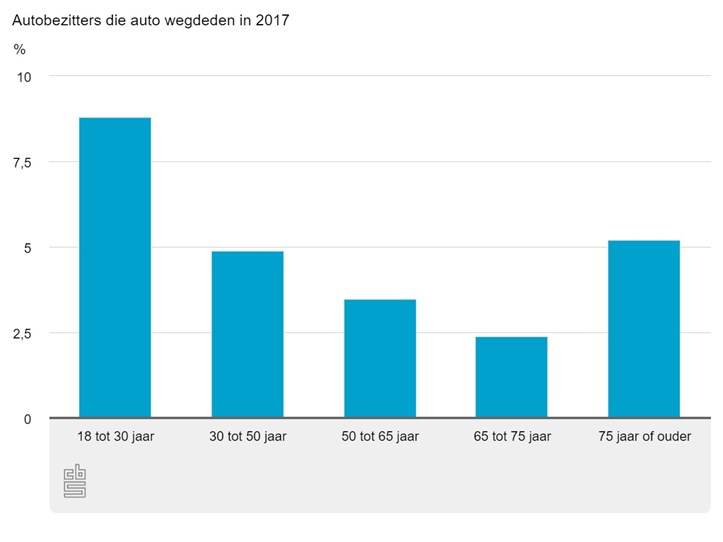 Van de jongeren die begin 2017 een auto hadden, had 8,8 procent geen auto meer op 1 januari 2018. Van de ouderen (75 jaar of ouder) was dat 5,2 procent. Van 20,4 procent van deze ouderen verliep in 2017 ook het autorijbewijs.