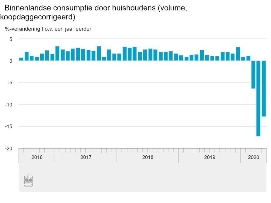 In de cijfers over mei zijn nog veel lockdown maatregelen van de overheid zichtbaar. Afwachten is wat de huidige ‘anderhalve meter economie’ voor gevolgen heeft. Die invloed wordt pas in komende rapporten van het CBS zichtbaar.