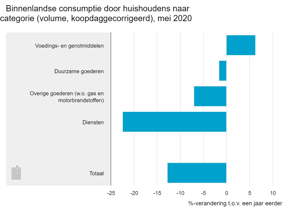 De uitgaven aan diensten lagen in mei 22,4 procent lager dan een jaar eerder. Hieronder vallen onder meer een bezoek aan een restaurant, theater, pretpark of sportschool. Ook deelname aan het openbaar vervoer wordt gezien als een dienst, waar minder gebruik van werd gemaakt. Aan diensten als internetabonnementen, verzekeringen en koeriersdiensten gaven consumenten juist meer uit.