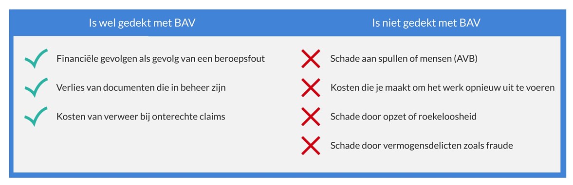 De BAV is bedoeld voor onbedoelde fouten. Opzet of roekeloosheid is dus niet gedekt. Ga dus altijd zorgvuldig aan de slag en stel procedures voor je werknemers op om nalatigheid te voorkomen. Wat verder onder de BAV valt, is afhankelijk van de specifieke verzekeringsdekking. Ga dus eerst goed de voorwaarden na voordat je de BAV afsluit. Globaal kunnen we stellen dat het volgende vaak wel of niet onder de verzekering valt.