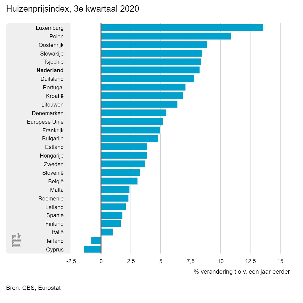 De prijzen van alle koopwoningen, uitgedrukt in de huizenprijsindex, stijgen al sinds begin 2014. Voor het grootste gedeelte gaat het om bestaande koopwoningen. In vergelijking met de Europese Unie stegen de huizenprijzen in Nederland in 2020 sterker. De huizenprijzen in de Europese Unie waren in het derde kwartaal van 2020 gemiddeld 5,2 procent hoger dan in hetzelfde kwartaal een jaar eerder. In Nederland stegen de huizenprijzen in dezelfde periode met 8,3 procent. Luxemburg kende met 13,6 procent weer de grootste stijging. Alleen in Cyprus en Ierland daalde de huizenprijs.
