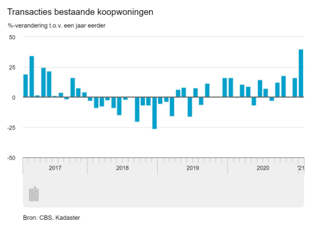 Het Kadaster registreerde in januari 24.516 woningtransacties. Bijna 40 procent meer dan in dezelfde maand een jaar eerder. Dit is de grootste procentuele stijging sinds januari 2015. De stijging heeft mogelijk te maken met de veranderingen rondom de overdrachtsbelasting. Starters tot 35 jaar hoeven geen overdrachtsbelasting te betalen en beleggers betalen nu 8% belasting.