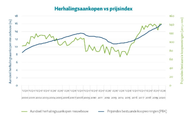 De bouw van nieuwe woningen kan de vraag ernaar niet bijhouden. Het aanbod per koper is hierdoor beperkt, waardoor de prijs stijgt. Eigenaren die eerder nieuwbouw kochten, profiteren van de prijsstijging en hebben een bovengemiddelde overwaarde. Deze overwaarde kunnen ze vervolgens weer inzetten bij het kopen van de volgende nieuwbouwwoning.