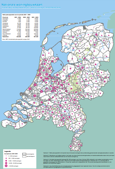 Op de kaart staat de locatie van ruim 961.000 nieuwbouwwoningen. Bovenop dit aantal moeten extra woningen gerealiseerd worden vanuit herstructurering en transformatie projecten. Bijvoorbeeld door oude kantoor- en winkelpanden om te bouwen tot woningen.