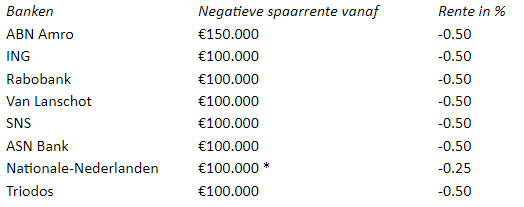 Begin juli hanteren de onderstaande banken een negatieve spaarrente vanaf het aangegeven banksaldo: