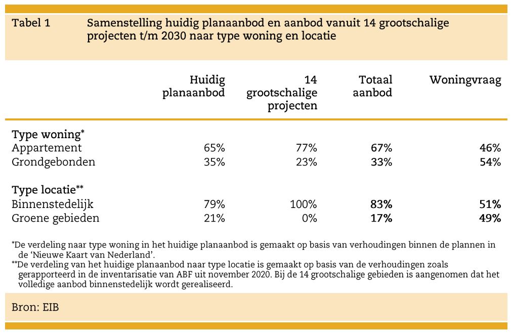 Het EIB heeft gekeken naar de bouwplannen tot 2030, in relatie tot de verwachte vraag. Daarbij wordt onderscheid gemaakt tussen appartementen en grondgebonden woningen. Vooral in stedelijke gebieden neemt het geplande aantal appartementen harder toe dan de verwachte vraag. Hierbij is al rekening gehouden met zaken als individualisering, migratie en vergrijzing.