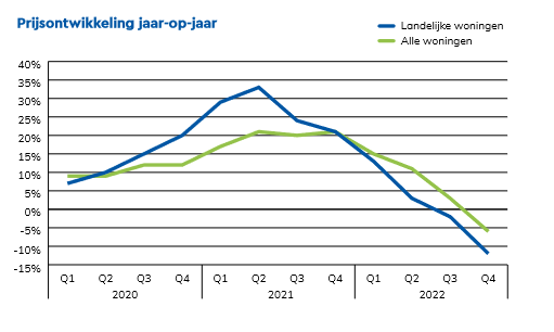 Een landelijke woning heeft vaak een groter oppervlakte dan een reguliere woning. Het is daarom niet vreemd dat het energielabel een belangrijke factor is bij de verkoopprijs. Zo daalden de gemiddelde prijzen voor landelijke woningen met label E en F met bijna twintig procent (-17% en -19%). Opvallend is dat soortgelijke woningen met label G met -11% minder hard daalden.