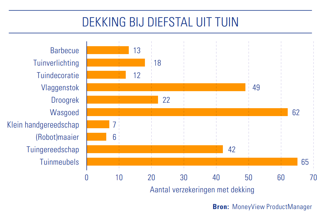 Stelen uit de tuin is over het algemeen een koud kunstje. Spullen die in de tuin horen zijn doorgaans gedekt op de inboedelverzekering. Bij slechts één van de onderzochte verzekeraars moet je dit aanvullend verzekeren. Spullen die eigenlijk binnenshuis horen, zoals een tv of mobiel, zijn niet gedekt als ze uit de tuin gestolen worden. Toch is niet alle tuininboedel bij elke verzekeraar gedekt. In onderstaande tabel zie je de verschillen. Controleer bij het afsluiten van de verzekering goed wat wel en niet gedekt is.